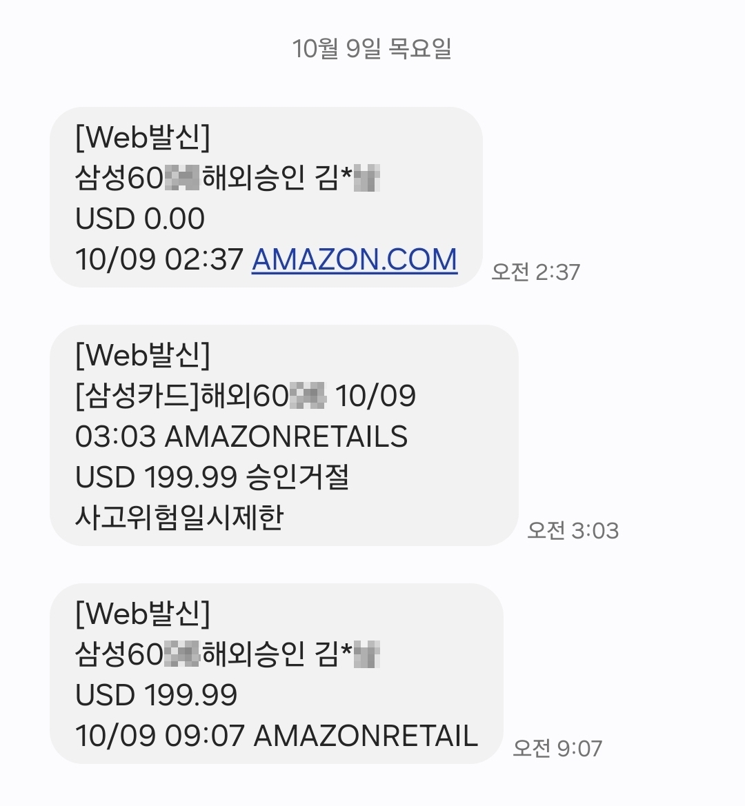 새벽에 아마존에서 SSD를 주문했으나 승인거절이 되었다. 몇분 후 삼성카드 상담사가 곧바로 연락을 해와 내게 어떤 상황인지 묻고 결제가 될거라는 이야기를 했으나 현대카드로 결제를 했다. 풋살을 마치고 차에서 승인이 됐다는 문자를 받았다. 집에 도착해 현대카드 주문을 취소했다. 요즘엔 곧바로 승인이 나지 않고 배송시작할 때 승인이 되는 것 같다.