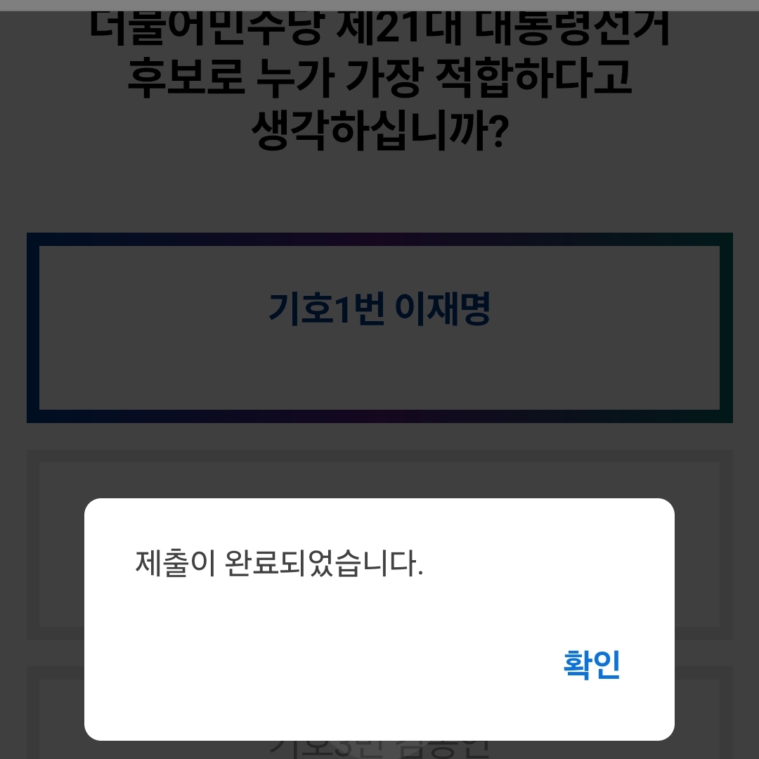 더불어민주당 제21대 대통령후보자 선출을 위한 수도권.강원.제주 순회경선 온라인투표가 개시되어 이재명 후보에게 1표 선사했다.