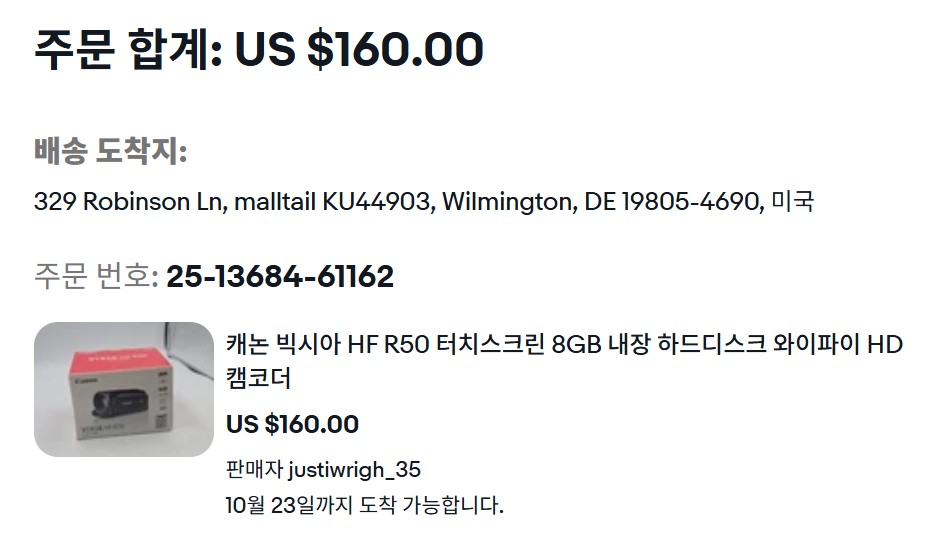 Canon VIXIA HF R50 TOUCHSCREEN 8GB Internal HDD Wi-Fi HD Camcorderhttps://www.ebay.com/itm/187622379517$180에 올라온 캐논 캠코더(2014.01 출시)를 장바구니에 넣었더니 판매자가 $20 낮춘 $160에 오퍼를 줘서 결국 수락을 했다. (카드사 승인금액 230,736원) eBay International Shipping $94.49 배송료가 워낙에 비싸서 예전에 이용했던 배대지 몰테일의 Delaware 주소로 주문을 넣었는데, 알고보니 카메라는 목록통관이 아니라 일반통관인 것이었다.이베이쇼핑(인터커머스코리아)에서 쿠폰 할인으로는 287,540원이었는데, 과연 싸게 산 것인지 의문이다.패밀리 라인으로는 R52, R500이..