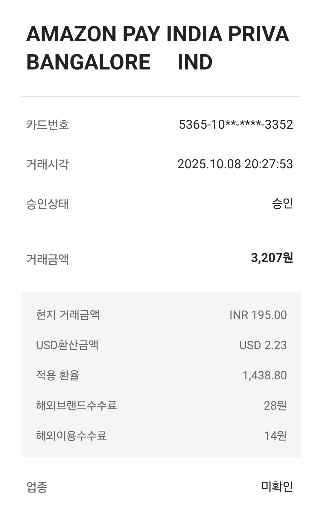 지난 7월 10일부터 시작한 Apple 인도계정을 통한 YouTube 프리미엄 구독의 연장을 위해 인도 아마존에서 1개월치 195루피를 충전했다. 이 같은 우회구독자를 색출할 것이라는 공지가 있었지만 아직까지는 별탈없는 것 같다. 체크카드로 3,207원이 청구되었다.