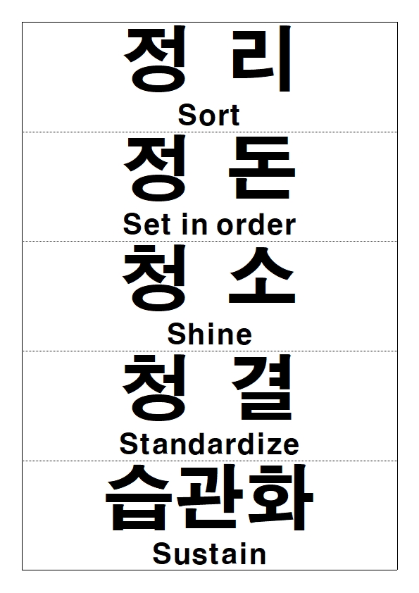 도요타가 만들어 모범이 되어 여러 현장에서도 강조하는 정리, 정돈, 청소, 청결, 습관화를 나도 실천하고자 여러장 인쇄해 활동반경에 붙였다.