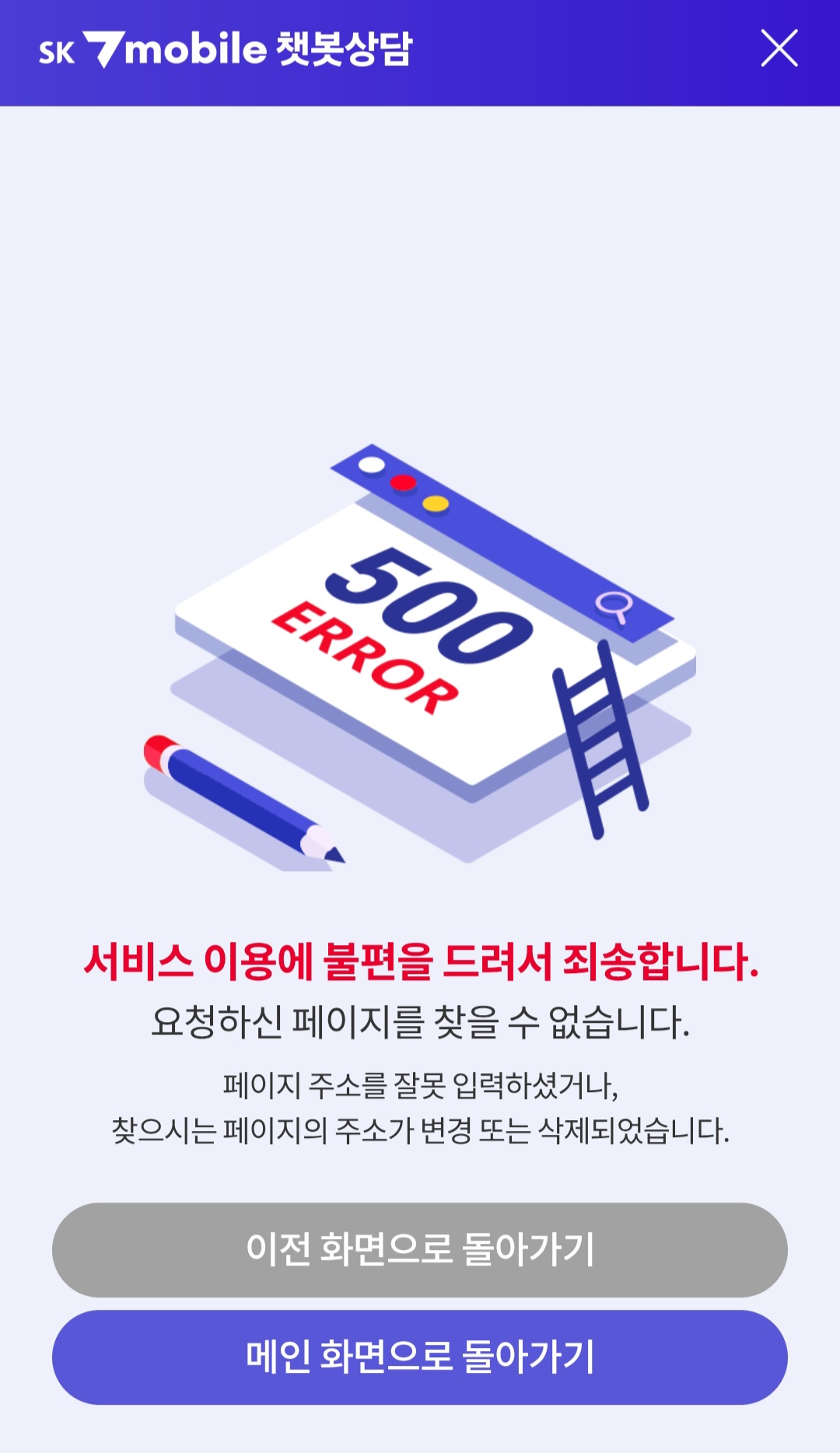 기존에 사용하던 SK 7모바일을 해지접수를 하려는데 꼭 마지막에 500 에러가 떠서 마무리를 하지 못했다. 내일 고객센터에 연락해야겠는데 연결이 원활하게 될지 의문이다.