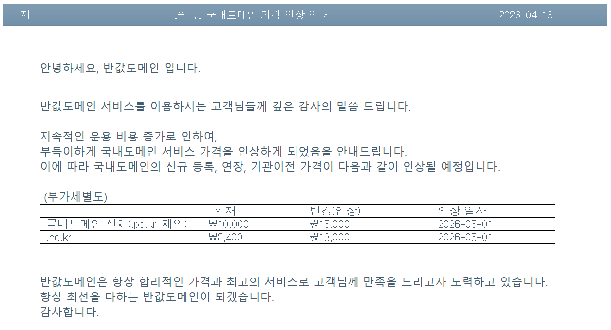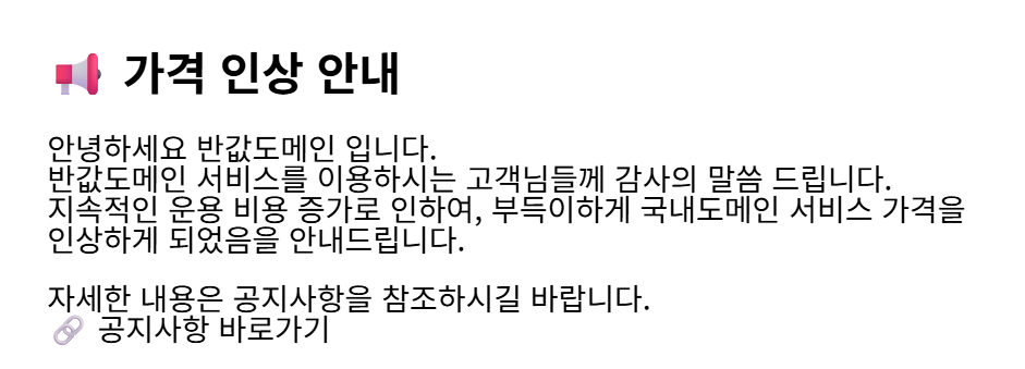 지난 19일에 도메인을 등록했는데, 이미 16일에 가격 인상을 공지했었던 것이었다.