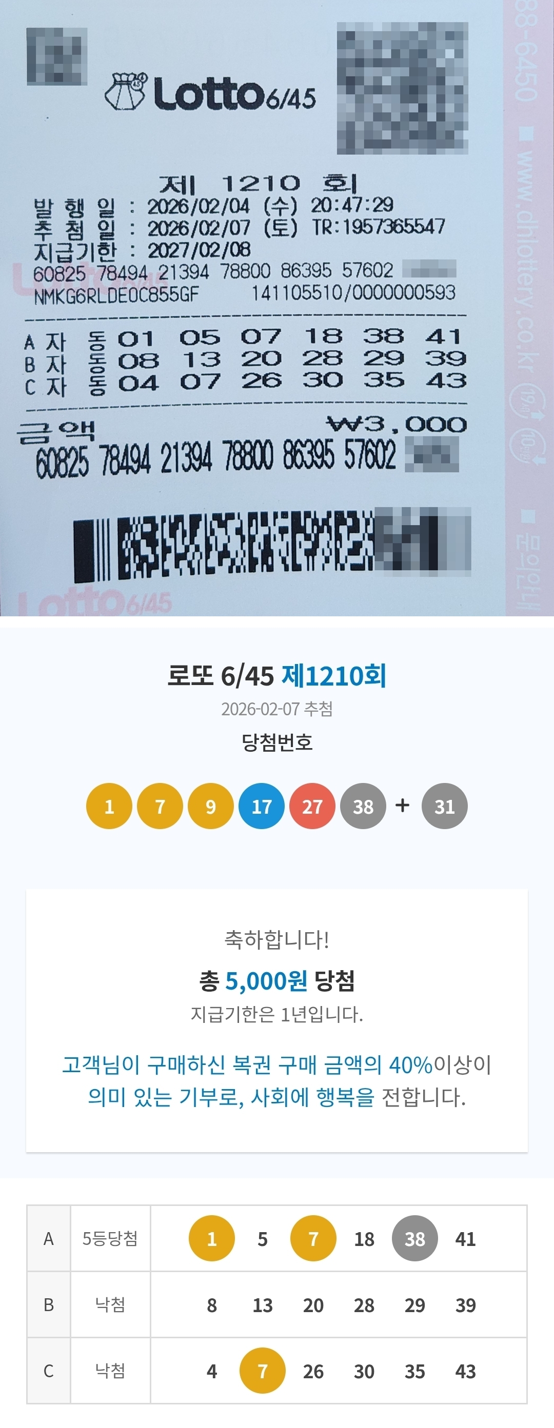 오랜만에 5등 당첨