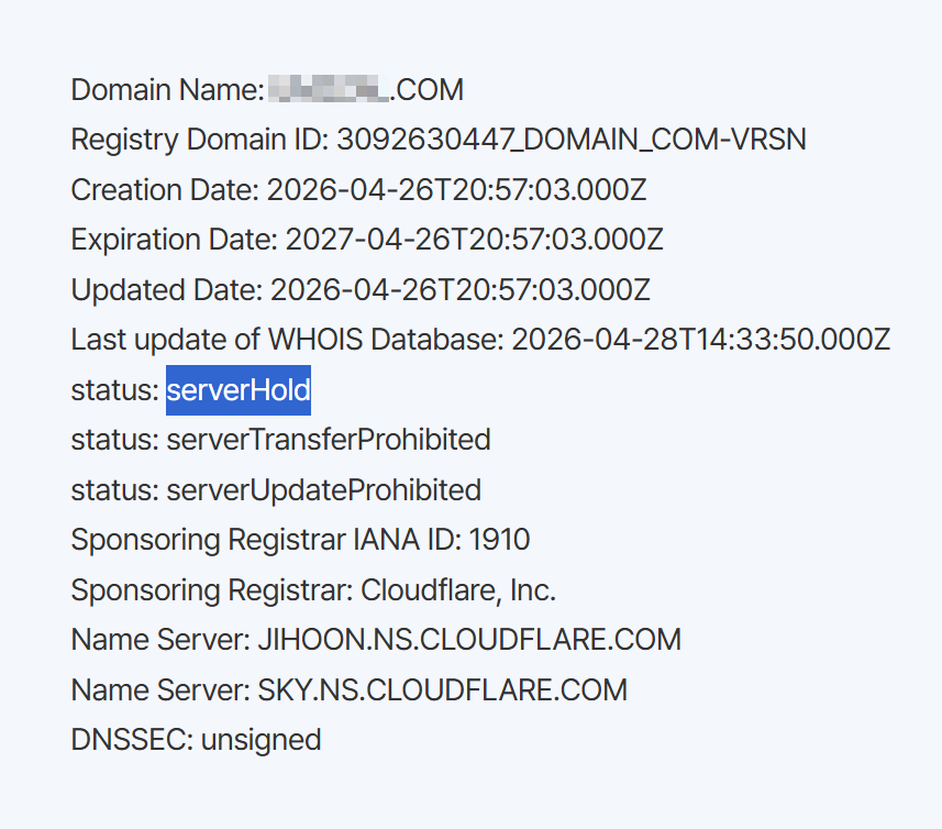 그래서 Gemini에게 물어봤더니 WHOIS 조회에서 serverHold가 나오면 도메인이 활성화되지 않은 상태라는 것이다. ChatGPT, Perplexity 또한 동일한 답변을 얻을 수 있었다.